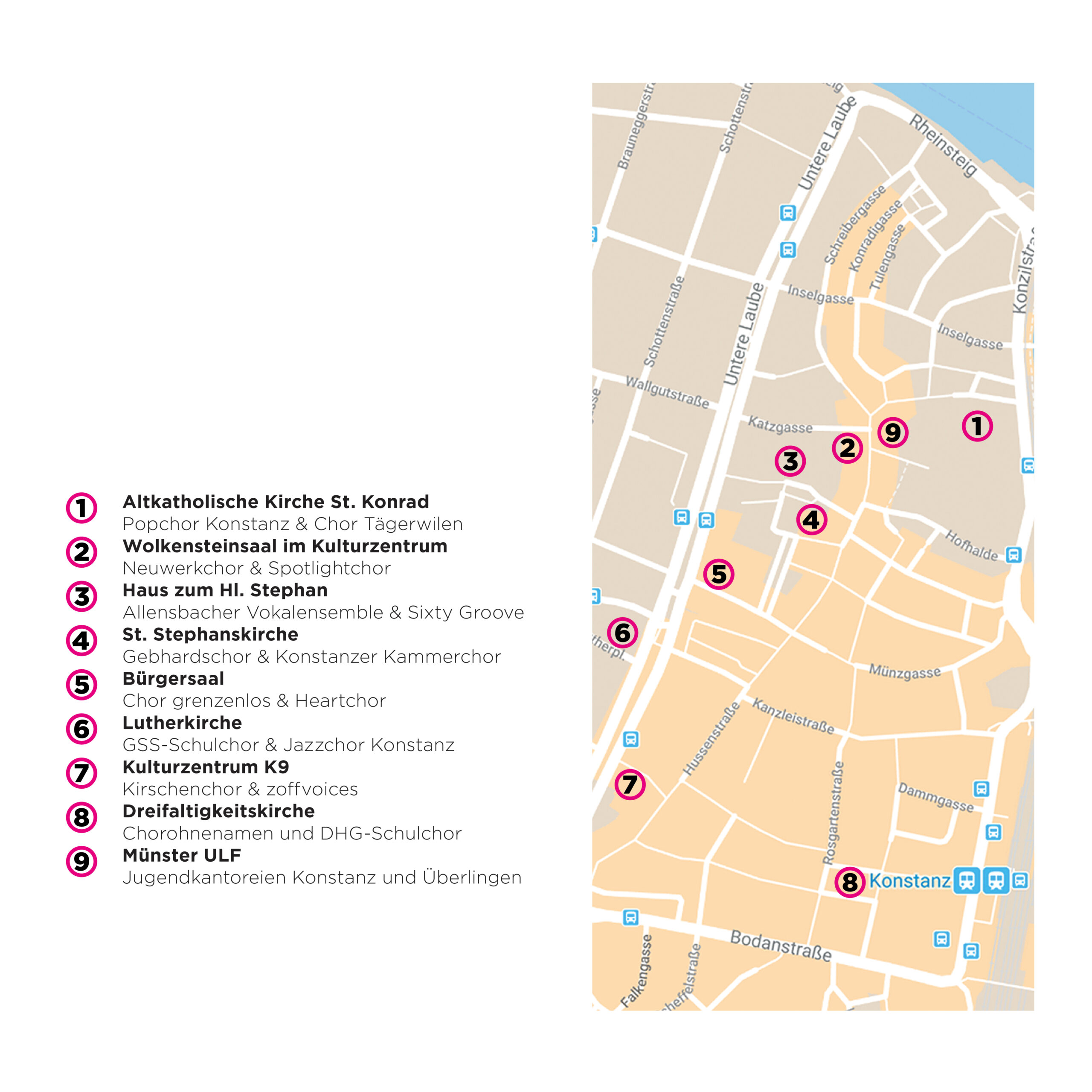 An diesem Abend prösentieren 18 Chöre in der Konstanzer City unseren Gästen ein opulentes musikalisches Menu: Klassik, Jazz, Pop – a cappella oder mit Instrumenten. Wählen Sie aus dem breiten Angebot Ihr persönliches Wunschprogramm aus!